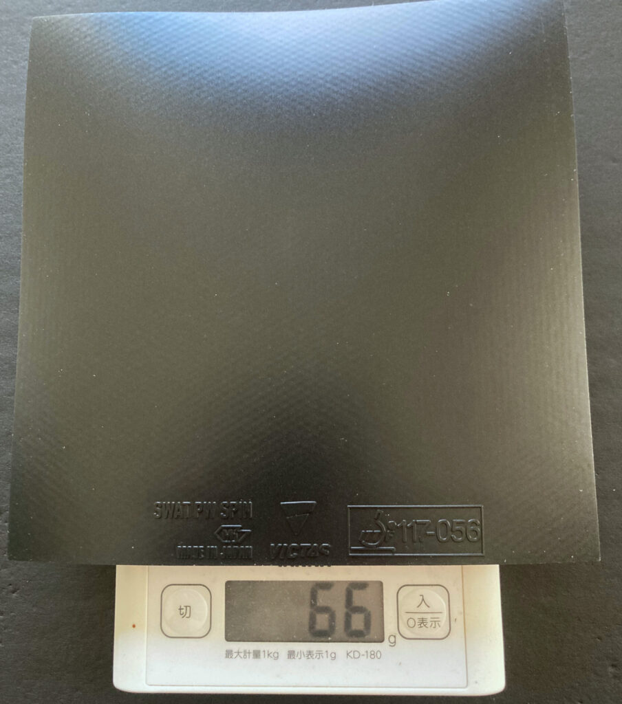 スワットスピンよりもスポンジ硬度が5度も硬くなっているため、「重くなっているのではないか?」と懸念される方も多いと思います。 そこで、パッケージ込みの重量を実測し、他の主要ラバーと比較しました。