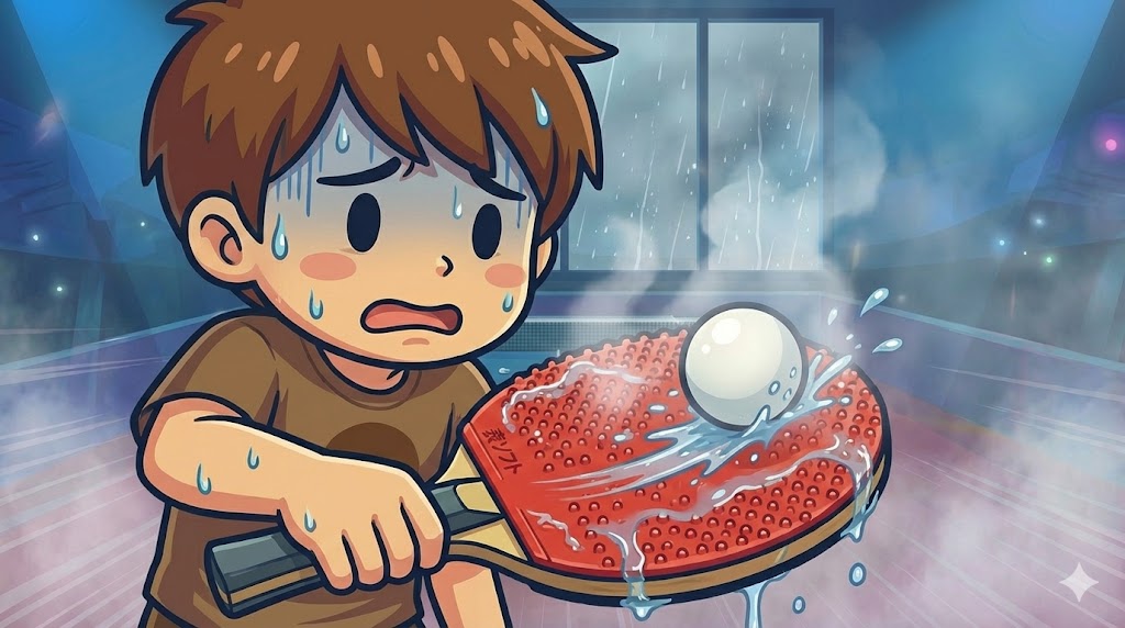 構造上、裏ソフトラバーに比べると湿気の影響は受けやすいですが、表ソフトの中ではそこまで極端に滑るわけではありません。