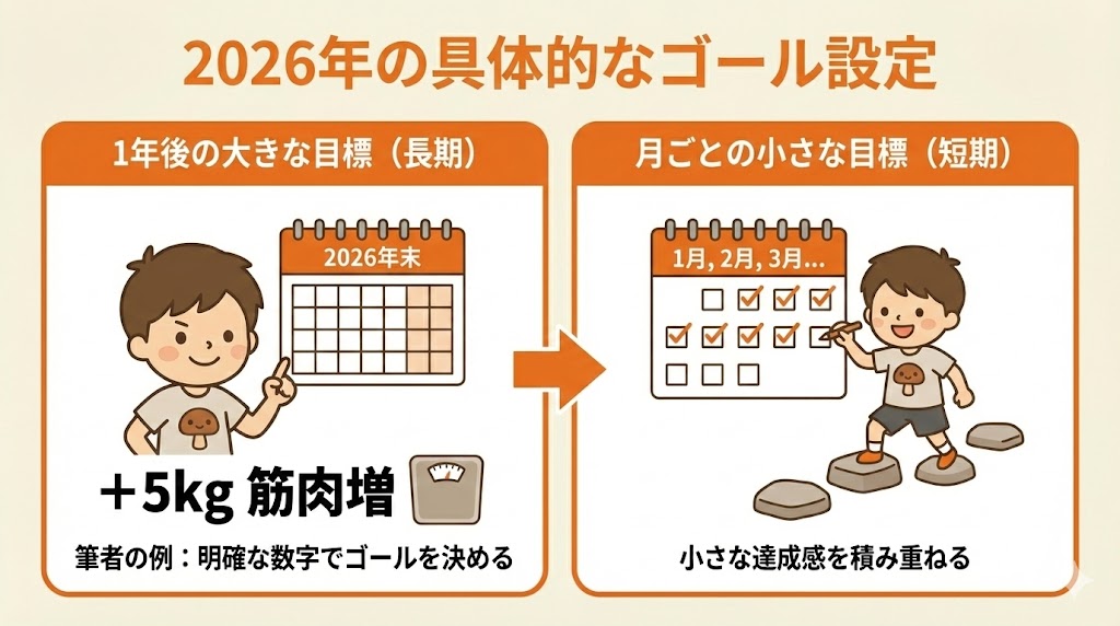 私自身の2026年のゴールは「筋肉量プラス5kg」です。このように具体的な数字を公表することで、自分への逃げ道を断つと同時に、読者の皆さんにとっても「自分ならどう設定するか」を考えるヒントにしてほしいと考えています。一緒に数字を追いかけ、変化を楽しんでいきましょう。