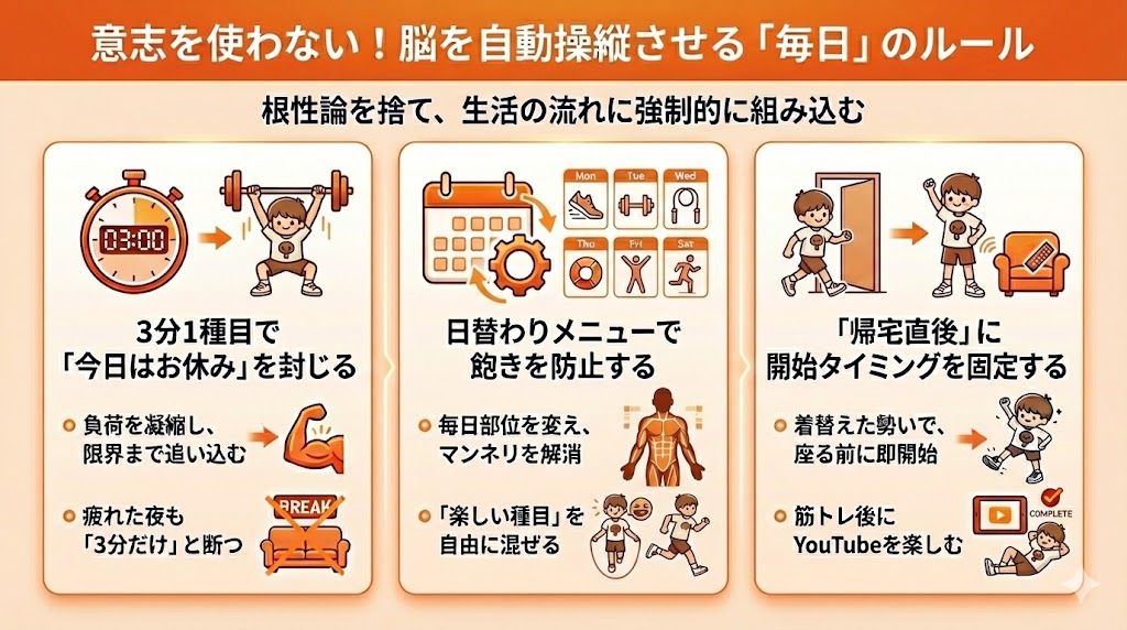 根性で頑張るのではなく、生活の流れの中にトレーニングを強制的に組み込むためのルールを解説します。