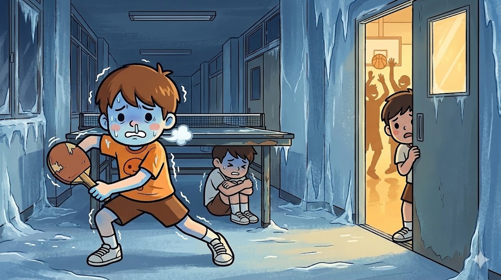 一方の卓球部は、ステージの上や暗い廊下へ追いやられていました。お前らはここで十分だろ、という周囲からの無言の圧力。冬の廊下で凍えながら打つ姿は、部活というより修行に近いものがありました。