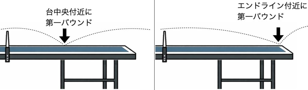 特にショートサーブにおいて有効な方法です。 自分のコートのどこに第1バウンドさせるかによって、相手コートでのバウンド(第2バウンド)の仕方が変わります。