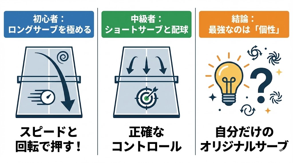 まず長いサーブでしっかり回転をかける土台を作り、その後に短いサーブを覚える方が、結果として上達が早くなります。