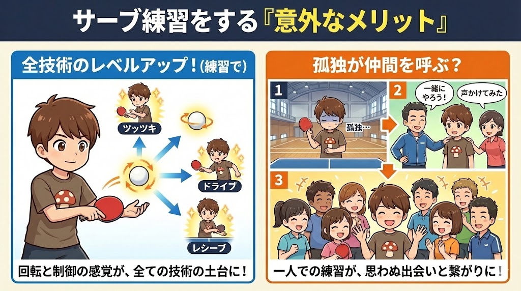 要するに、サーブを徹底的に練習することは、卓球というスポーツにおけるすべての技術の底上げに直結するわけです。