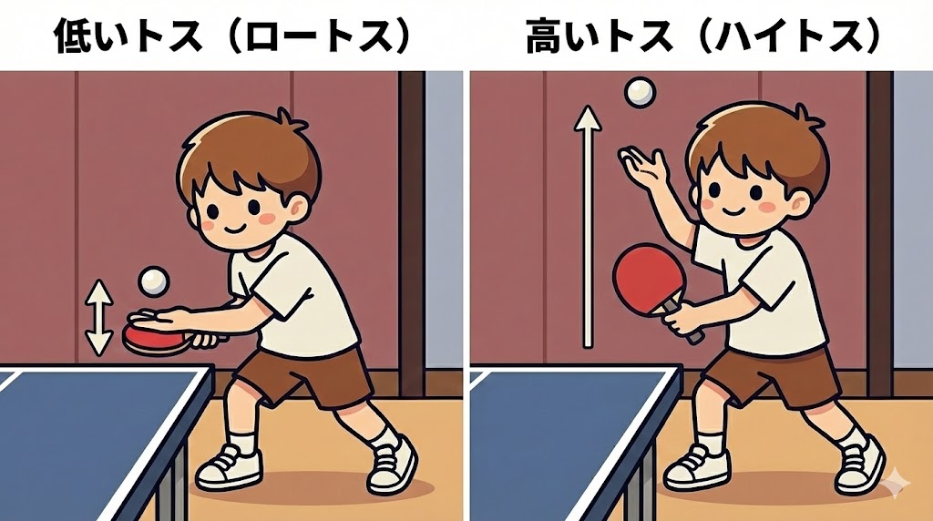 基本的なフォームは変えずに、トスの高さだけを変える方法です。 低いトス(ロートス)と高いトス(ハイトス)を使い分けることで、相手が受けるリズムや印象は大きく変わります。